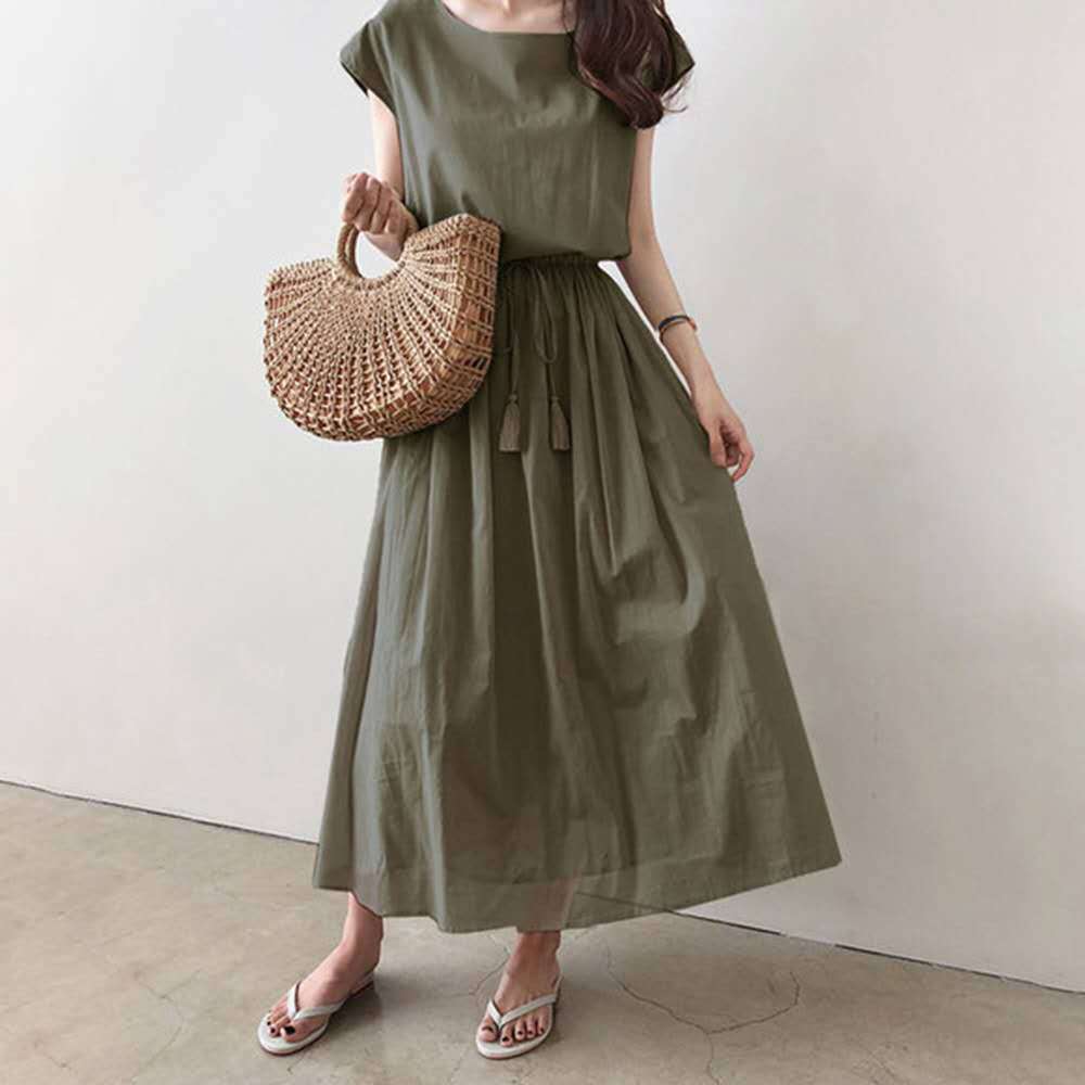 ワンピース フレアワンピース ワンピドレス ロング ロング丈 マキシ マキシ丈 袖なし ノースリーブ ラウンドネック フレア セミフレア Aライン ウエストゴム 綿 麻 かわいい 大人可愛い きれいめ 上品 お洒落 大人女子 こなれ感 ラフ 無地 春 夏 10代 20代 30代 OL 通勤 デート お出かけ 女子会 普段使い 楽ちん トレンド S M L XL 2XL
