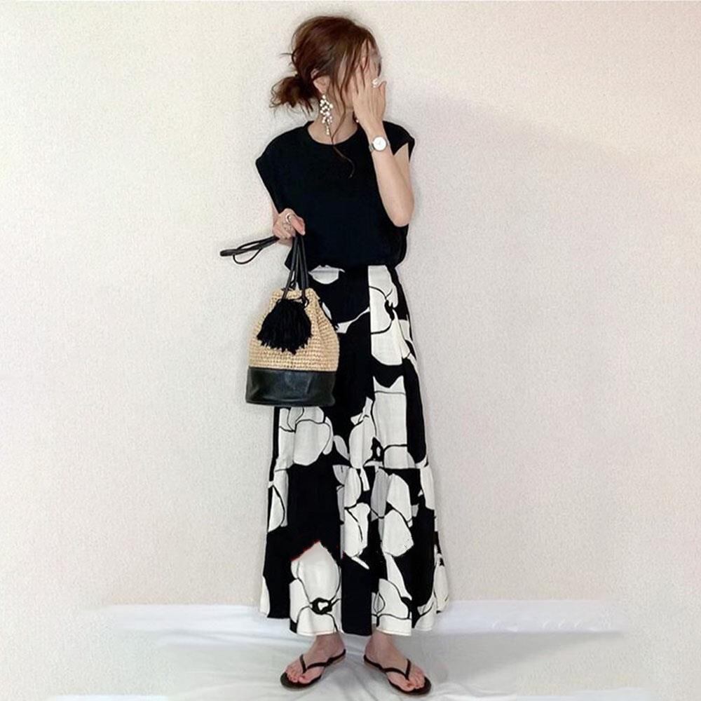 ラフに着れるセットアップです。二の腕が細く見える形のTシャツと、足長効果の出る大柄のロングスカートです。スカートのウエストは伸縮性があり、最大ストレッチ94cmなので安心です!