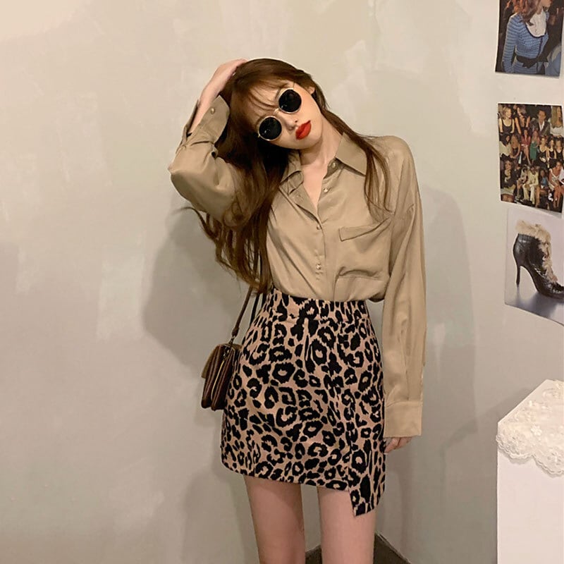 トップス スカート シャツ ミニ ミニ丈 袖あり 長袖 襟付き タイト ハイウエスト 上下セット 2点セット おしゃれ かっこいい レトロ セクシー 存在感 ヒョウ柄 レオパード 春 秋 冬 10代 20代 レディース 女性用 女子会 休日 イベント S M L ベージュ