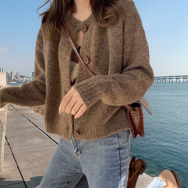 トップス カーディガン 袖あり 長袖 ラウンドネック クルーネック もこもこ モコモコ ふわふわ 前開き 厚手 かわいい 大人可愛い シンプル カジュアル ラフ ルーズ 無地 秋 冬 10代 20代 30代 レディース 女性用 ママ オフィス ビジネス OL 通勤 学生 通学 デート お出かけ 公園デビュー 休日 暖かい 防寒 S M L XL 白 ホワイト 緑 グリーン 茶色 ブラウン 灰色 グレー