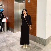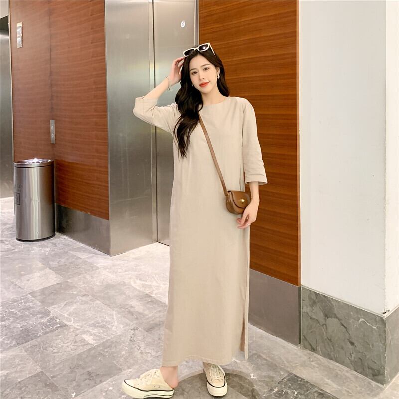 ワンピース フレアワンピース ワンピドレス ロング ロング丈 マキシ マキシ丈 袖あり 7分袖 七分袖 ラウンドネック ストレート Aライン サイドスリット かわいい 大人可愛い きれいめ シンプル カジュアル おしゃれ お洒落 こなれ感 ラフ 無地 春 夏 秋 10代 20代 30代 通勤 学生 通学 デート お出かけ 公園デビュー 女子会 お泊まり 休日 運動 旅行 海 プール 着回し 普段使い スタイル 楽ちん トレンド L XL 2XL 3XL 黒 ブラック アプリコット