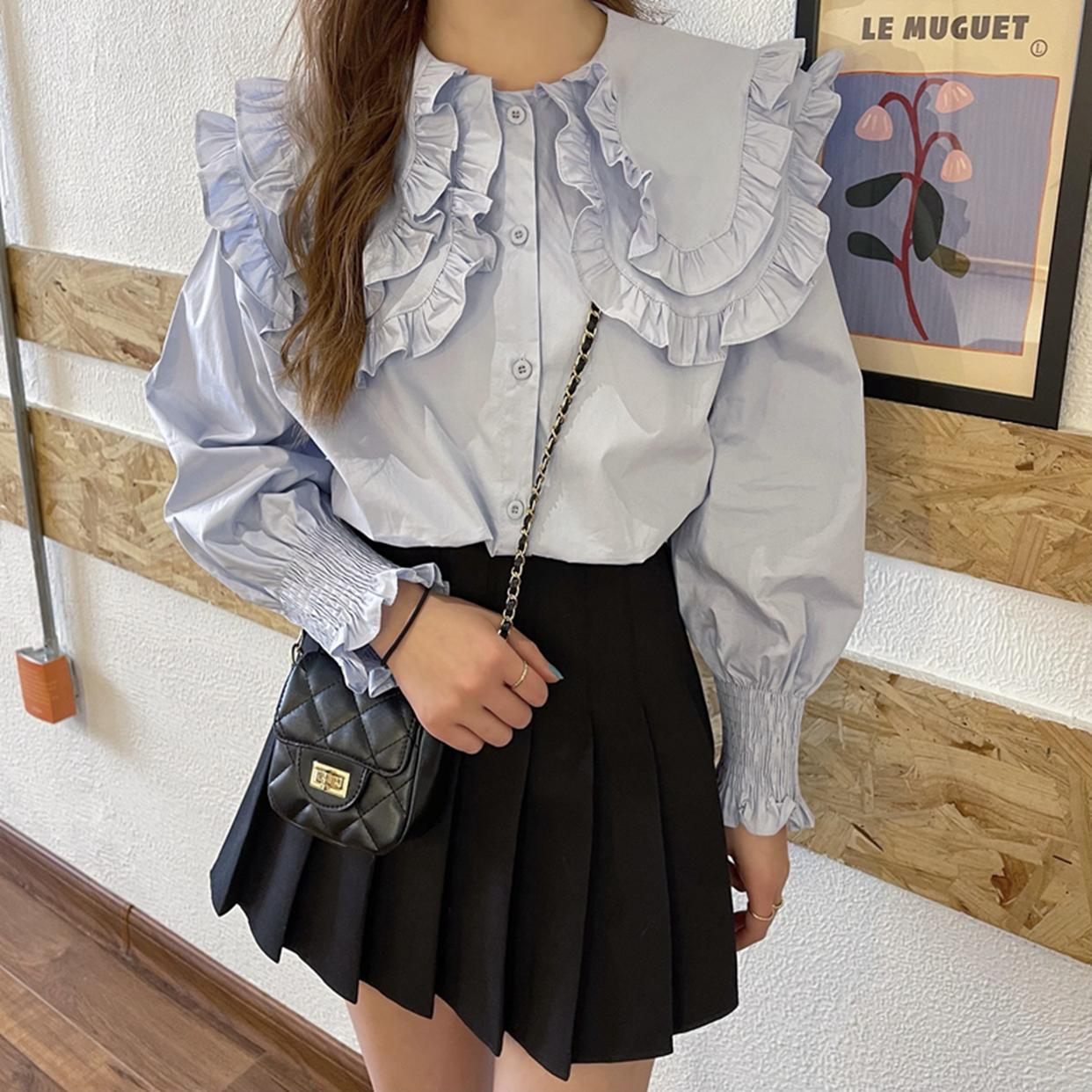 トップス シャツ ブラウス 袖あり 長袖 襟付き フリル 前開き かわいい レトロ ラブリー キュート ガーリー 無地 春 夏 秋 冬 10代 20代 30代 レディース 女性用 学生 通学 デート お出かけ 女子会 パーティー イベント リゾート 旅行 ホテル レストラン 重ね着 トレンド 流行 S M L XL 白 ホワイト 水色