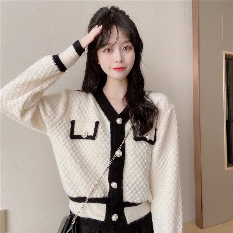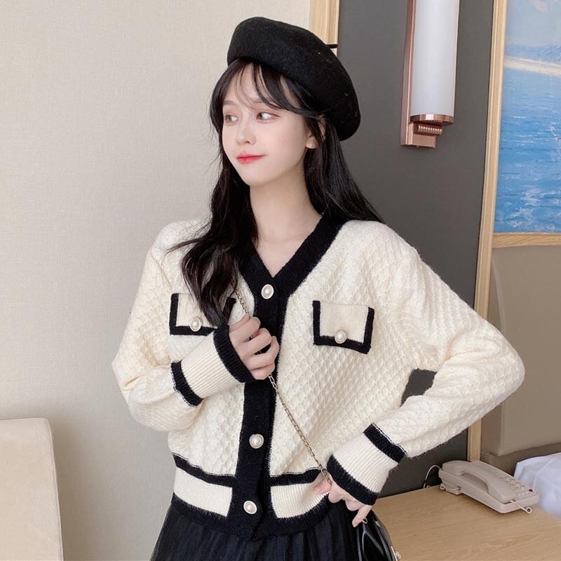 パール風ボタンがレトロかわいいデザインのカーディガン