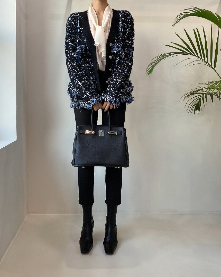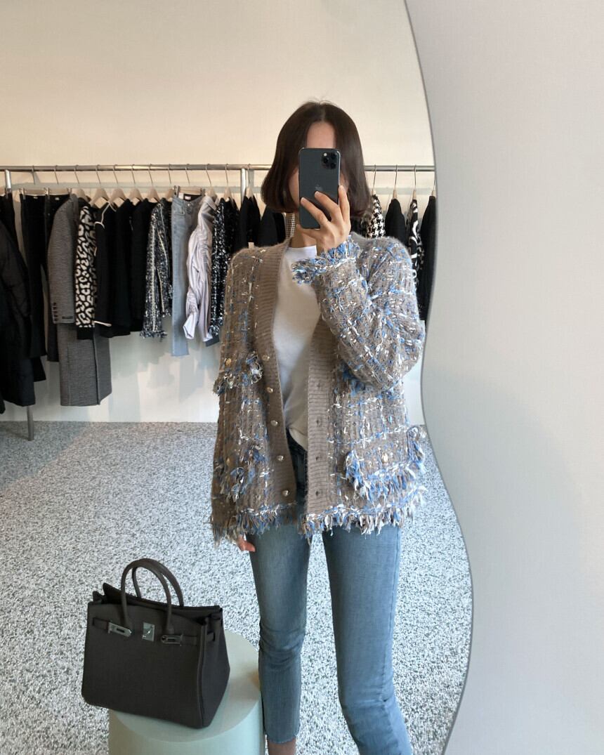 ツイードジャケットほどかっちりせず、無地のカーディガンほどカジュアルにならずの