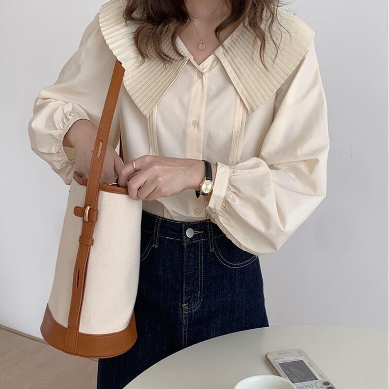 ビッグカラー トップス シャツ ブラウス 袖あり 長袖 襟付き プリーツ 前開き かわいい 大人可愛い カジュアル おしゃれ レトロ ラブリー キュート ガーリー 無地 春 夏 秋 10代 20代 レディース 女性用 学生 通学 デート お出かけ 女子会 お泊まり 休日 パーティー イベント ホテル レストラン フリーサイズ 白 ホワイト 青 ブルー
