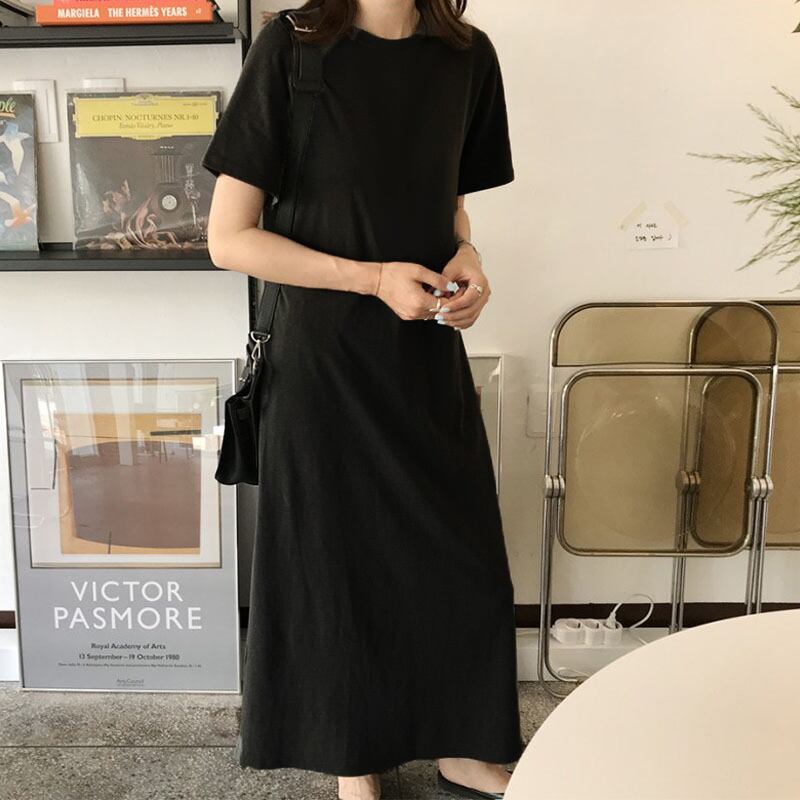 無地のシンプルデザインなマキシ丈半袖ワンピース。