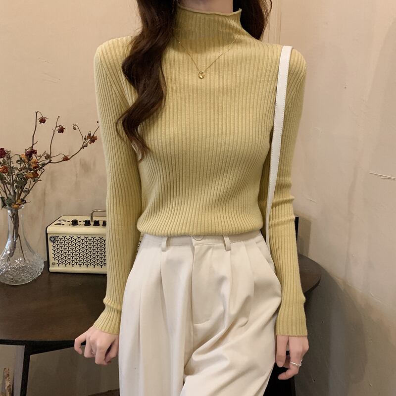 スリムなハイネックリブニット。