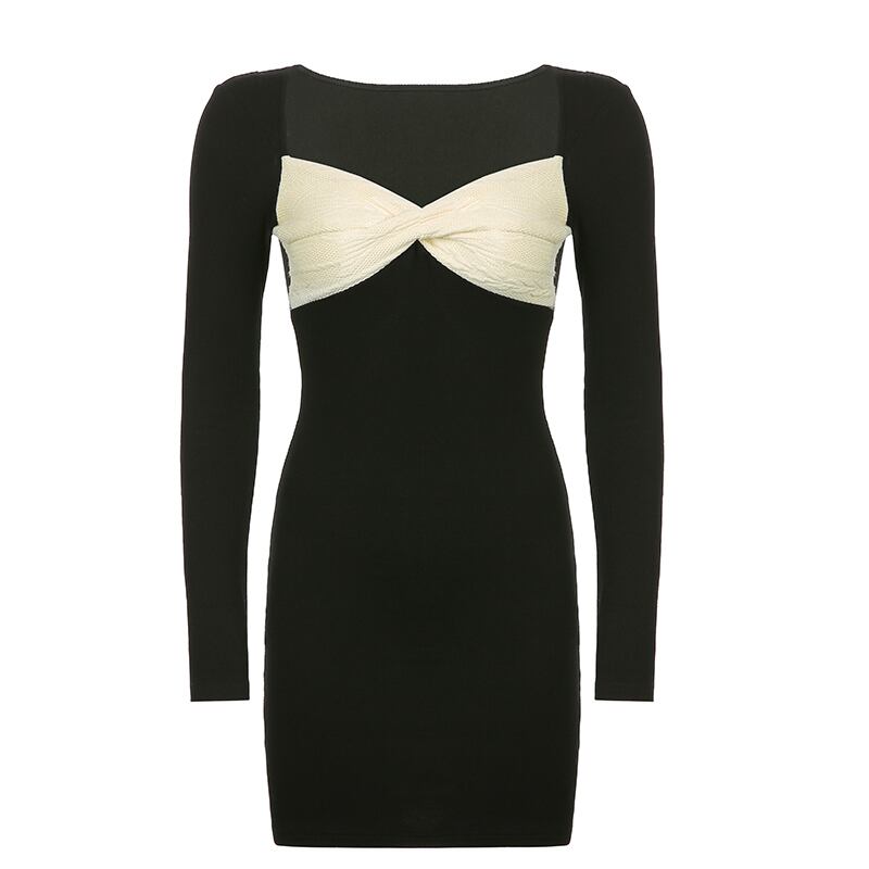 ワンピース ミニスカート ミニ ミニ丈 袖あり 長袖 スクエアネック タイト リボン 切り替えデザイン ニット かわいい お洒落 ラブリー キュート セクシー 主役級 存在感 無地 謝恩会 ハロウィン クリスマス バレンタイン 10代 20代 レディース 女性用 デート お出かけ 女子会 休日 パーティー イベント モテ S M L 黒 ブラック
