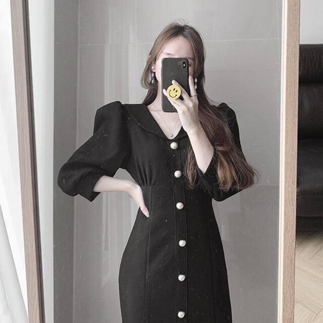 ワンピース フレアワンピース ミモレ ミモレ丈 ロング ロング丈 アンクル丈 袖あり 7分袖 七分袖 ボリューム袖 パフスリーブ Vネック 襟付き スリム タイト 細身 マーメイド シフォン ウエストマーク かわいい 大人可愛い 上品 おしゃれ お洒落 大人可愛い 大人女子 ラブリー キュート エレガント 無地 春 夏 秋 10代 20代 レディース 女性用 OL デート お出かけ 女子会 休日 韓国 韓国系 コーデ スタイル 楽ちん モテ S M L 黒 ブラック ベージュ