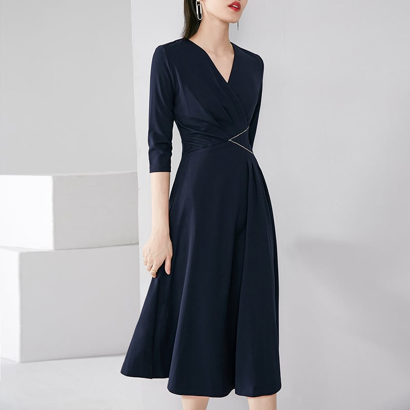 ワンピース フレアワンピース 膝丈 ひざ丈 袖あり 7分袖 カシュクール フレア ファスナー きれいめ シンプル 上品 おしゃれ セクシー エレガント フォーマル 無地 春 夏 秋 冬 オールシーズン 入学式 入園式 卒業式 卒園式 クリスマス 20代 30代 40代 レディース 女性用 ビジネス OL 通勤 デート お出かけ 女子会 お泊まり パーティー リゾート ホテル レストラン S M L XL 2XL ネイビー