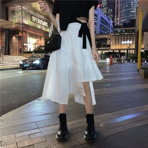 トップス スカート セットアップ カットソー フレアスカート 膝丈 半袖 Uネック フレア アシンメトリー 切り替えデザイン フリル リボン ウエストリボン スリット サイドスリット 上下セット かわいい おしゃれ お洒落 かっこいい ラブリー キュート ガーリー 個性的 セクシー 主役級 無地 夏 20代 30代 40代 レディース 女性用 学生 デート お出かけ 女子会 休日 パーティー イベント 着回し S M L ホワイト ブラック