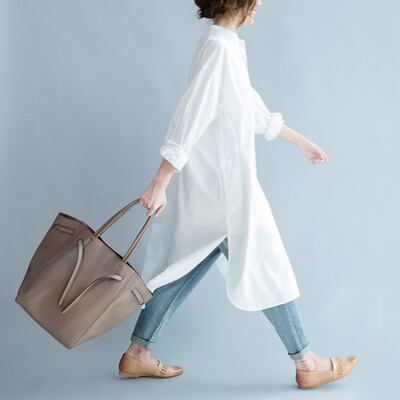 ゆったり着用できるシャツワンピース。