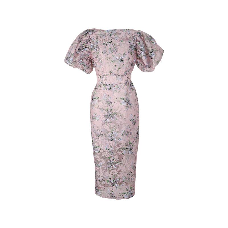 ワンピース ワンピドレス ミモレ ミモレ丈 ロング ロング丈 袖あり 半袖 ボリューム袖 パフスリーブ ラウンドネック スリム タイト ウエストマーク スリット バックスリット ファスナー ハイウエスト 上品 レトロ セクシー エレガント 主役級 存在感 柄 花柄 春 夏 謝恩会 結婚式 二次会 披露宴 20代 30代 レディース 女性用 デート お出かけ 女子会 パーティー イベント ホテル レストラン S M L XL ピンク
