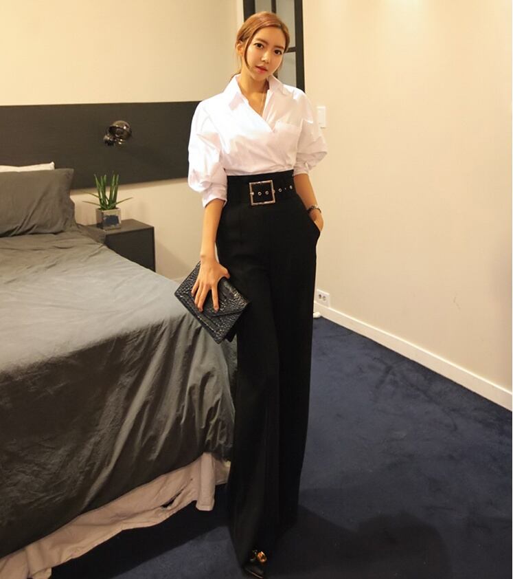 ブラウストップスはカシュクールデザインで胸元スッキリ魅せ、ボトムスはハイウェストに太めのベルトでスタイルアップ効果に。通勤、通学からオケージョンにも。