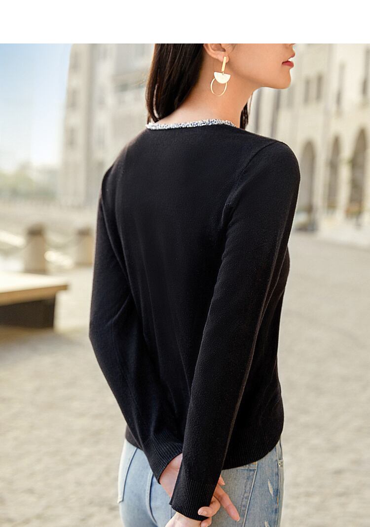 Vネックでスッキリ着用。