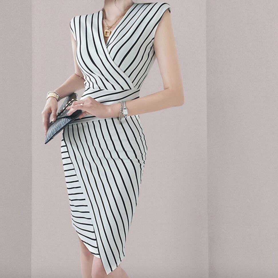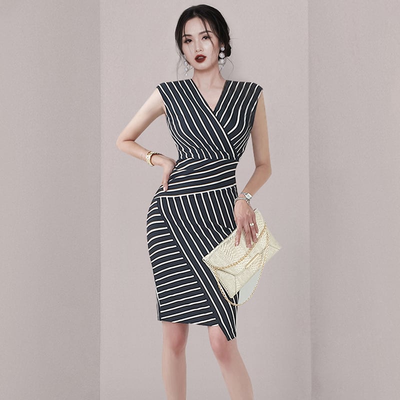 ストライプが特徴的なワンピースドレス。
