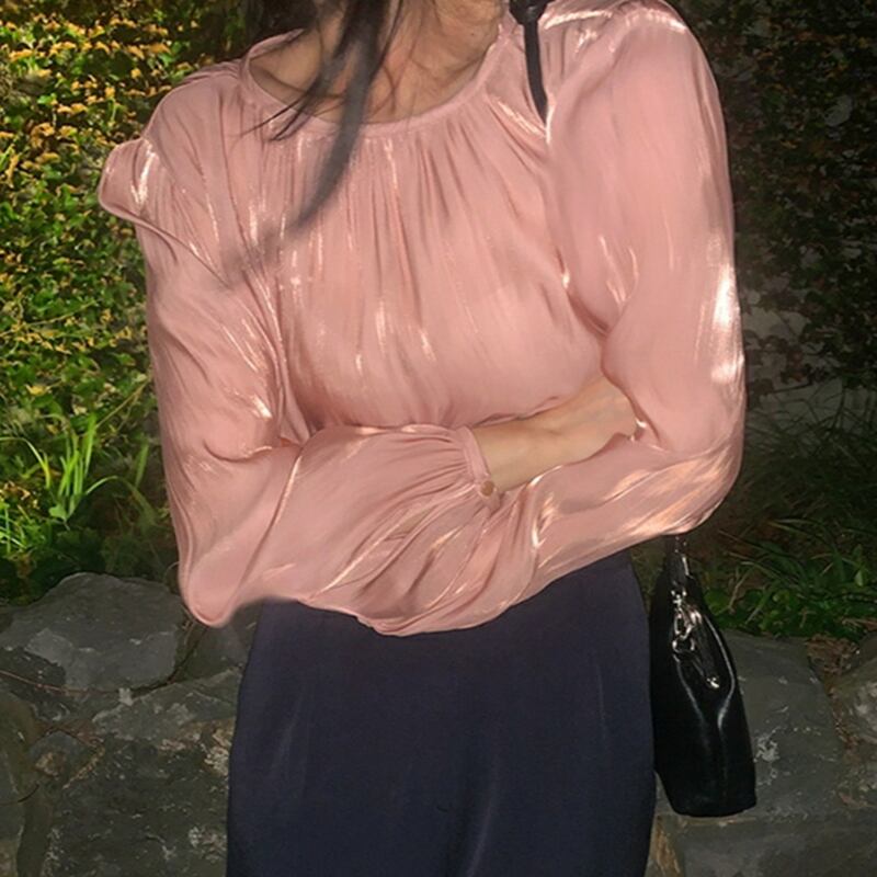 トップス デート ブラウス 長袖 パフスリーブ 透け感 薄手 かわいい 大人可愛い きれいめ シンプル 大人 上品 お洒落 ラブリー キュート ガーリー セクシー エレガント とろみ感 無地 春 秋 20代 30代 40代 レディース 女性用 学生 デート お出かけ 女子会 休日 着回し モテ フリーサイズ ホワイト ピンク 光沢