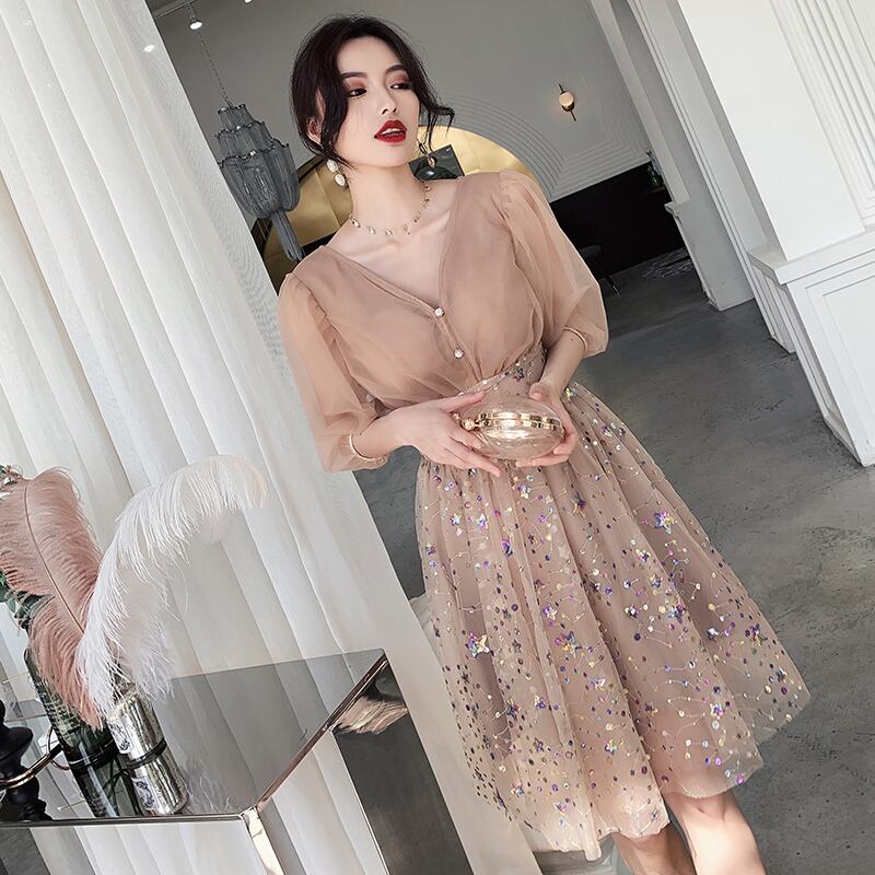 ワンピース ワンピドレス 膝丈 7分袖 パフスリーブ フレア 切り替えデザイン チュール シフォン 切り替えデザイン 透け感 シースルー 異素材MIX かわいい お洒落 ラブリー キュート ガーリー 主役級 存在感 柄 シーズンレス 結婚式 二次会 10代 20代 レディース 女性用 女子会 パーティー イベント モテ S M L XL 2XL 3XL ブラック ベージュ イエロー 光沢