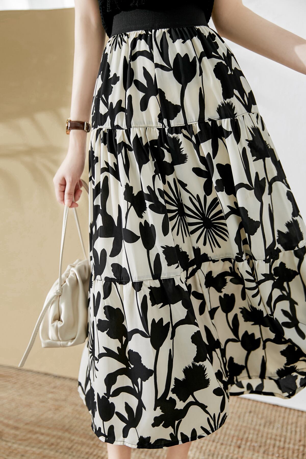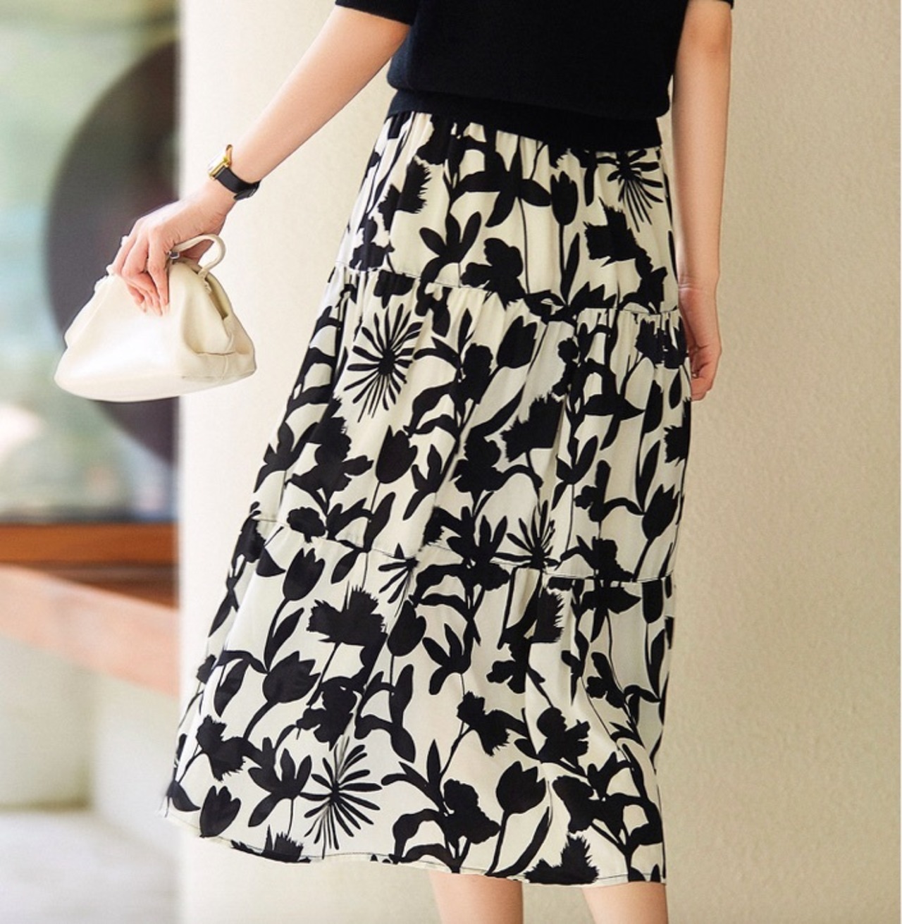 モノクロのカラーがシックなフレアスカートです。