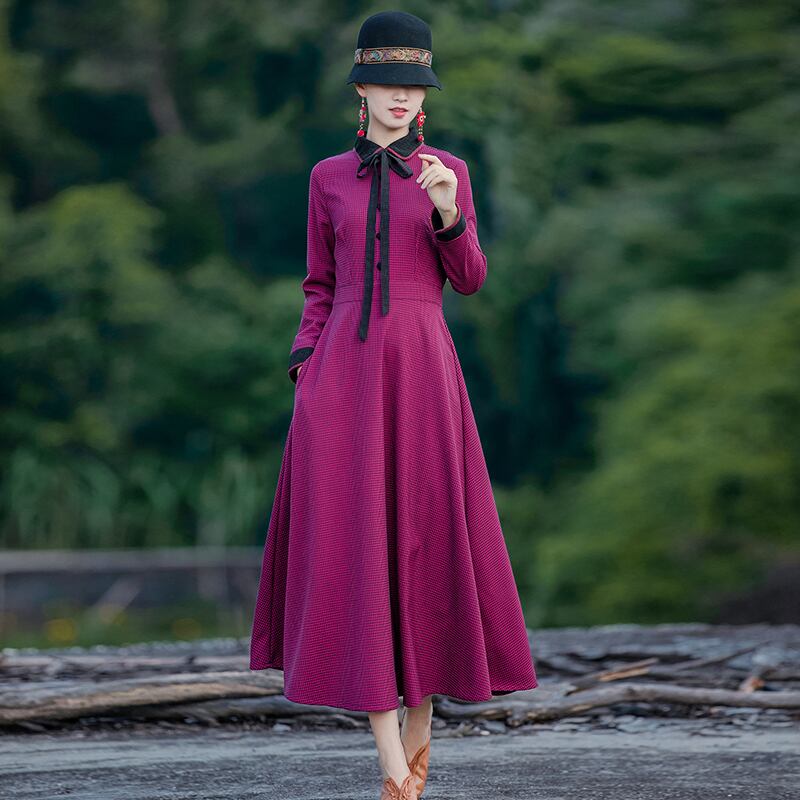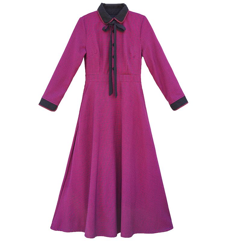 レトロ風 ワンピース フレアワンピース ロング丈 長袖 襟付き スリム 細身 リボン ハイウエスト 大人可愛い きれいめ お洒落 レトロ 大人女子 キュート ガーリー 個性的 チェック柄 格子柄 春 秋 20代 30代 レディース 女性用 お出かけ S M L XL パープル ピンク