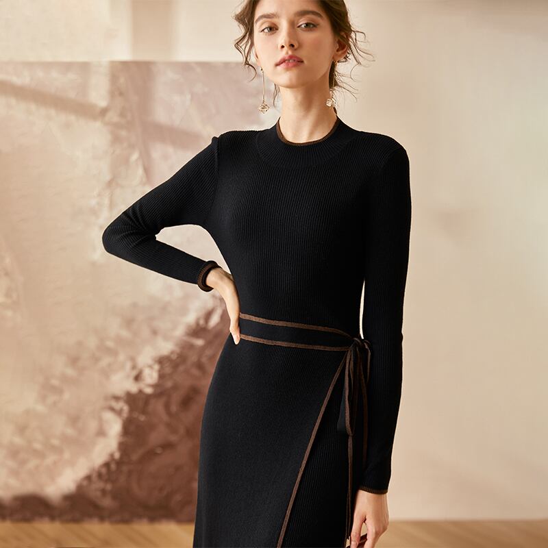 ワンピース デート ひざ丈 長袖 Uネック スリム タイト 細身 ストレート リボン ウエストリボン ハイウエスト リブ 伸縮性 大人可愛い きれいめ シンプル 大人 上品 お洒落 かっこいい 大人女子 クール セクシー 無地 春 秋 冬 10代 20代 30代 レディース 女性用 OL デート お出かけ 女子会 休日 S M L XL 2XL ブラック