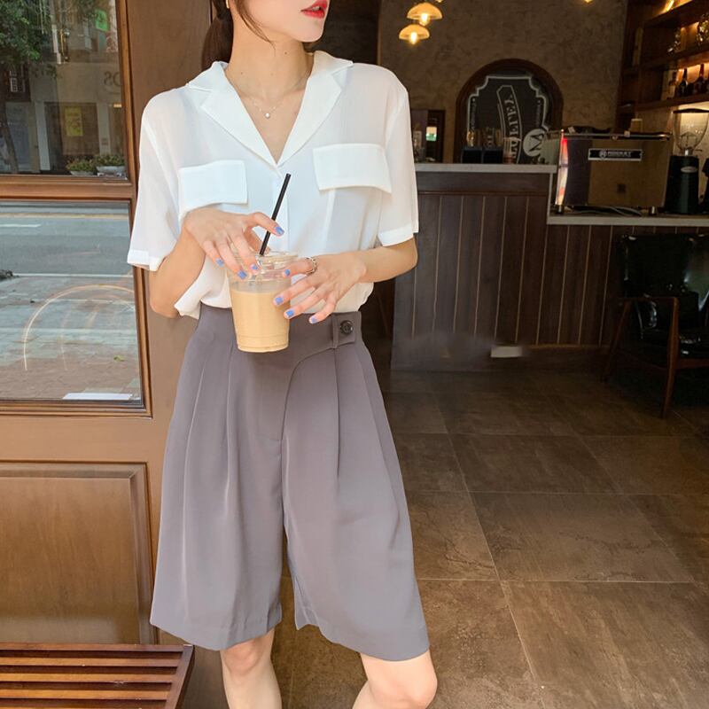 セットアップ レディース シャツ ブラウス 白シャツ タックパンツ ひざ丈 袖あり 半袖 オープンカラー 襟付き ポケット 前開き 薄手 上下セット 2点セット お得 かわいい 大人可愛い きれいめ シンプル カジュアル 大人 上品 お洒落 大人女子 こなれ感 ガーリー 主役級 抜け感 無地 春 夏 20代 30代 40代 ママ 通勤 通学 デート お出かけ 女子会 休日 旅行 着回し 普段使い 重ね着 モテ 脚長 定番 トレンド 流行 S M L XL ゆったり 白トップス グレートップス