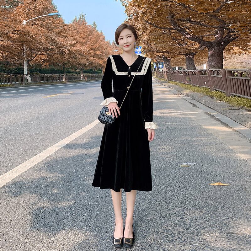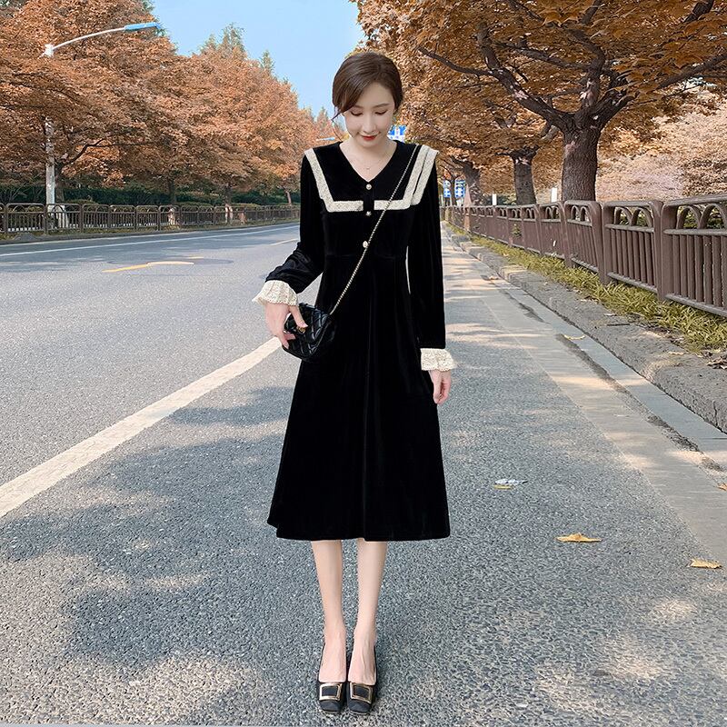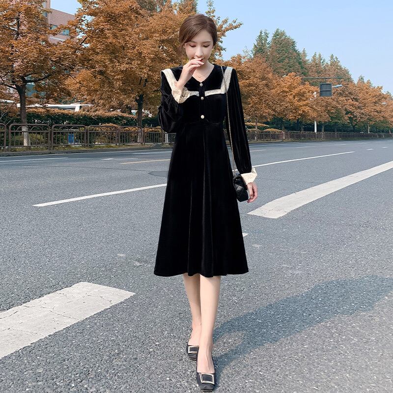 ワンピース デート レース フレアワンピース 膝丈 長袖 Vネック Aライン レース ハイウエスト ベロア かわいい 上品 お洒落 ラブリー キュート ガーリー 無地 春 秋 冬 10代 20代 30代 レディース 女性用 デート お出かけ 女子会 休日 着回し S M L XL 2XL ブラック