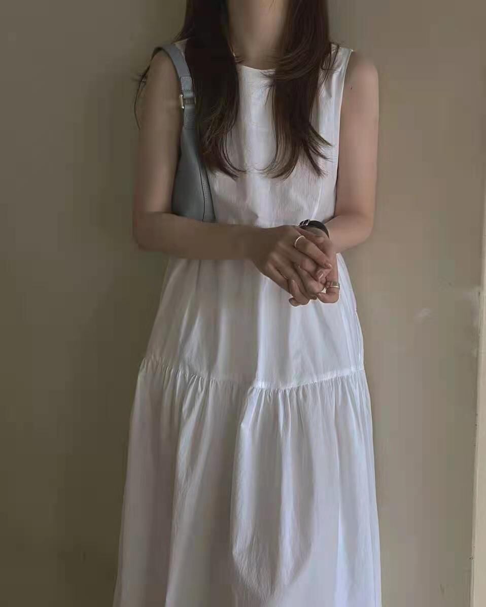 シンプルデザインのノースリーブティアードロングワンピース。