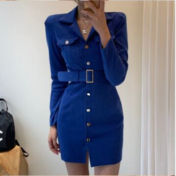 ワンピース シャツワンピース ショート丈 長袖 パフスリーブ 襟付き スリム タイト 細身 ベルト ハイウエスト 大人 お洒落 かっこいい クール セクシー 存在感 無地 春 秋 10代 20代 レディース 女性用 お出かけ 女子会 休日 パーティー イベント オルチャン ファッション コーデ S M ブラック ブルー ベージュ ピンク ライトブルー