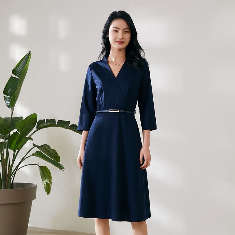 ワンピース フレアワンピース 膝丈 7分袖 Vネック Aライン ベルト ハイウエスト 大人可愛い シンプル 大人 上品 大人女子 クール フォーマル 無地 シーズンレス 20代 30代 40代 50代 女性用 ビジネス OL デート お出かけ 女子会 休日 XS S M L XL 2XL ネイビー