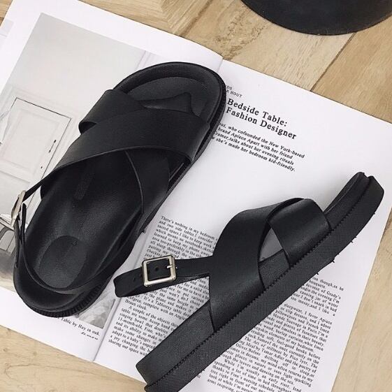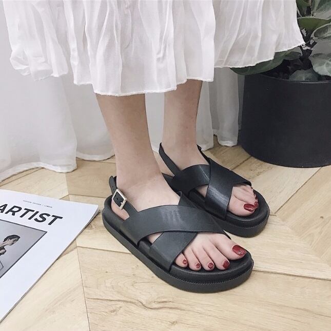 バックストラップ付きで安定感があり、歩きやすい。クロスデザインのベルトもお洒落。靴下を合わせるのもオススメです。
