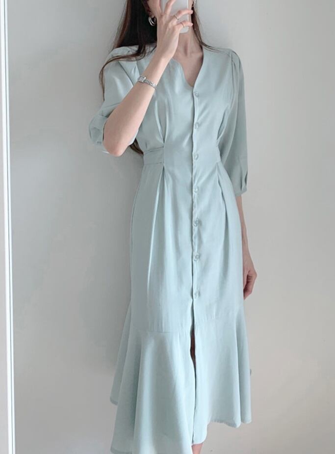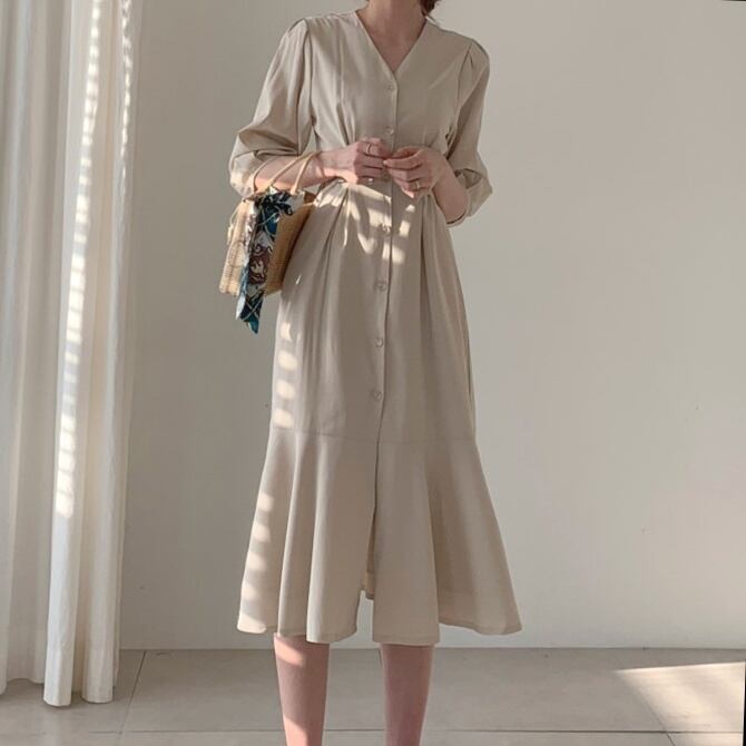 ワンピース レディース シャツワンピース ひざ丈 袖あり 5分袖 Vネック 襟なし スリム 細身 マーメイド 切り替えデザイン ウエストリボン 大人可愛い きれいめ シンプル カジュアル 大人 上品 お洒落 大人女子 こなれ感 ガーリー エレガント 主役級 抜け感 無地 春 夏 秋 20代 30代 40代 ママ 通勤 通学 デート お出かけ 女子会 休日 リゾート 旅行 着回し 普段使い 重ね着 韓国系 オルチャン モテ 定番 トレンド インスタ映え S M パステルカラー ライトブルー カーキ