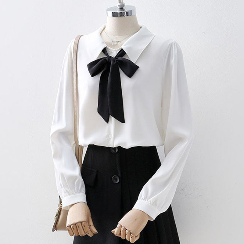 モノトーン配色のボウタイ付き長袖シフォンブラウス。