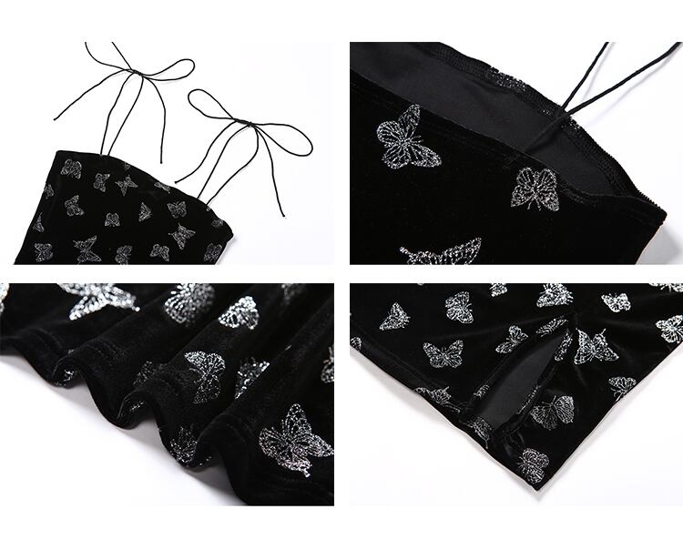 伸縮性があり、バタフライのラメプリントがポイントの一着となっています。