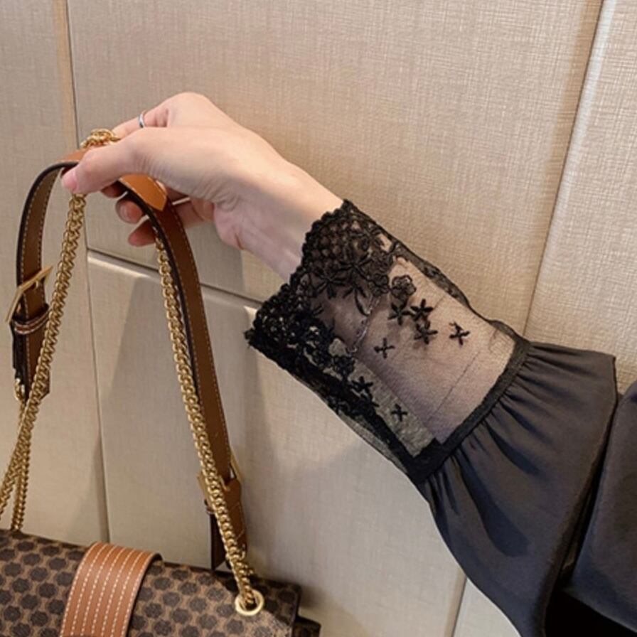 レースと透け感が女性らしくて素敵な長袖シャツです。カジュアルにもきれいめにも着こなせるアイテムで、ストレートなシルエットが品のある大人の雰囲気。お洒落な女子にぴったりの一枚です。