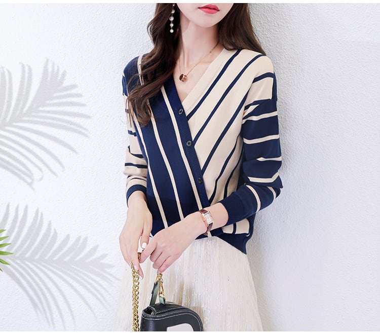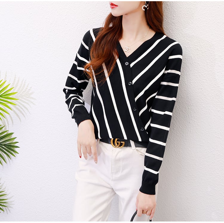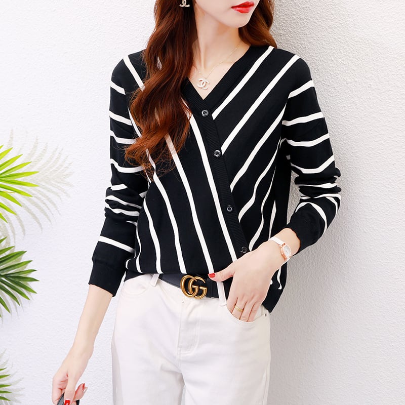 送料無料 ニットセーター トップス ニットソー 袖あり 長袖 Vネック カシュクール 大人可愛い きれいめ カジュアル 上品 おしゃれ お洒落 レトロ 大人女子 こなれ感 クール 存在感 柄 ボーダー ストライプ 秋 冬 20代 30代 40代 50代 レディース 女性用 ママ オフィス