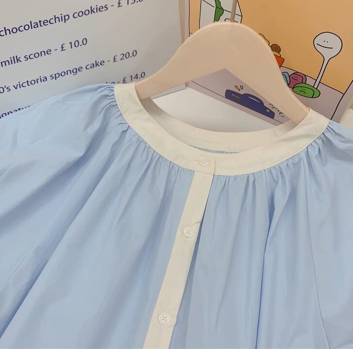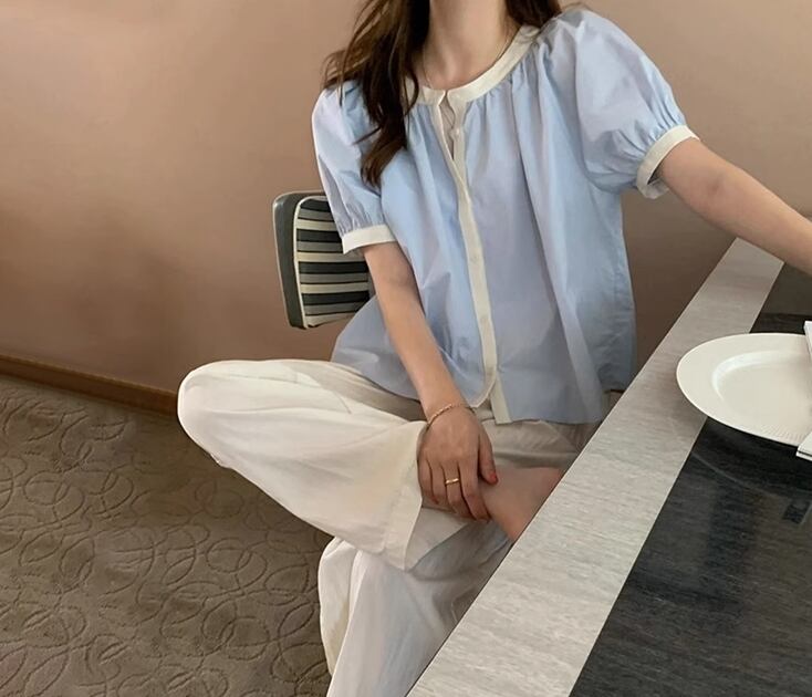 送料無料 トップス ブラウス 袖あり 半袖 パフスリーブ ラウンドネック 襟なし 綿 かわいい 大人可愛い シンプル カジュアル おしゃれ お洒落 レトロ マニッシュ ガーリー 無地 春 夏 10代 20代 30代 レディース 女性用 ママ オフィス OL 通勤 学生 通学 デート お出かけ