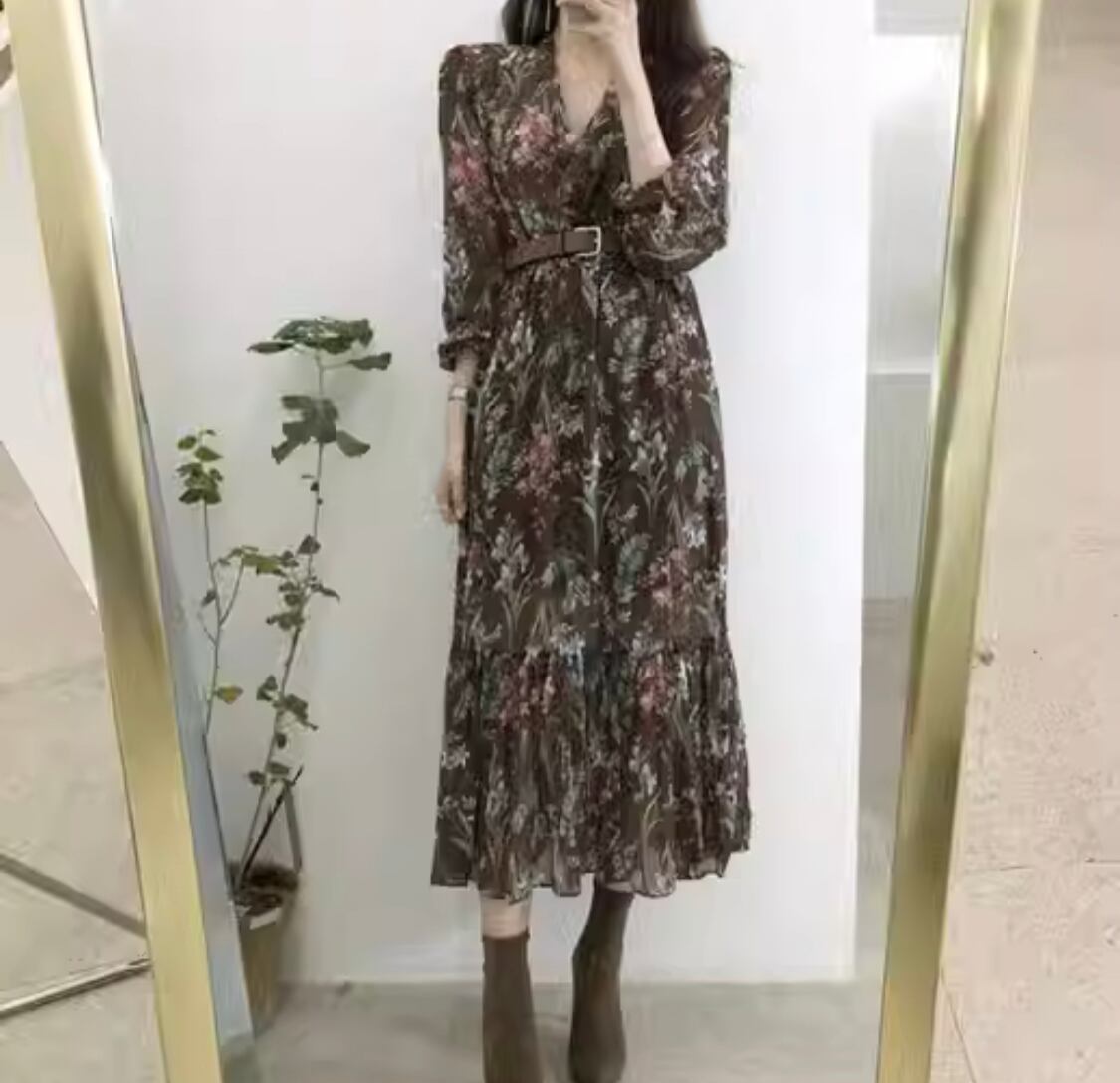 レトロ感漂う落ち着いた大人カラーの花柄シフォンワンピース。