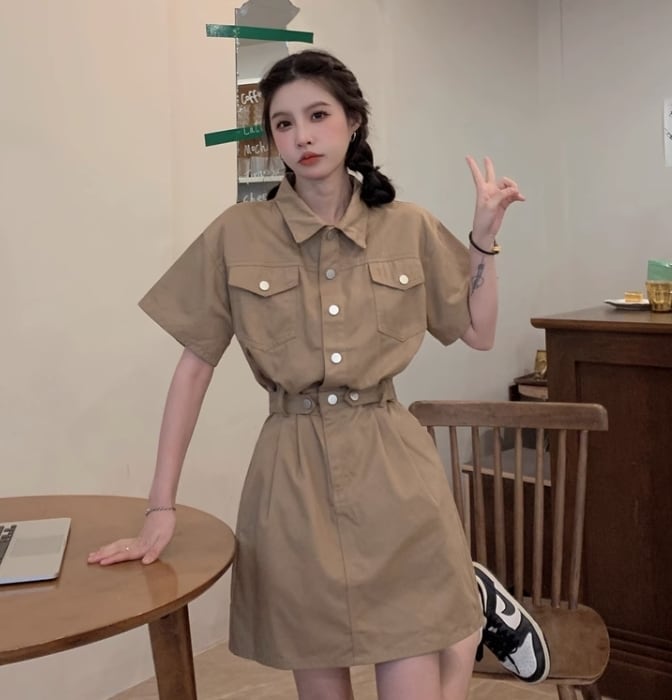 ミニ丈、Aラインシルエットが魅力的な一着です。襟付きデザインやウエストマークが女性らしさを演出してくれます。また、ポケット付きで機能性もバツグン。カジュアルにもラフにも着こなせるので、幅広いシーンで活躍できます。