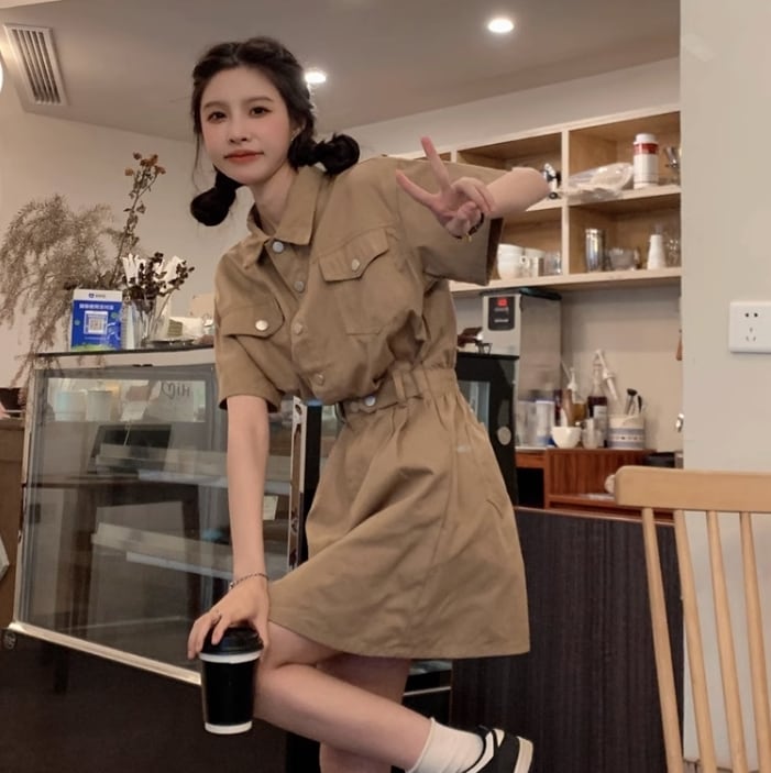 送料無料 ワンピース ミニ ミニ丈 ショート ショート丈 袖あり 半袖 Vネック 襟付き Aライン ウエストマーク ポケット かわいい カジュアル おしゃれ お洒落 かっこいい ラフ ボーイッシュ 無地 春 夏 10代 20代 30代 レディース 女性用 ママ 学生 通学 デート お出かけ