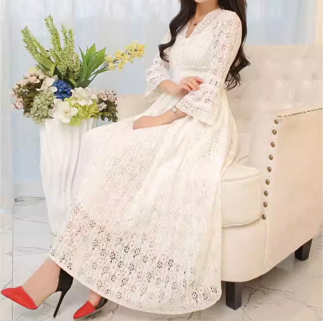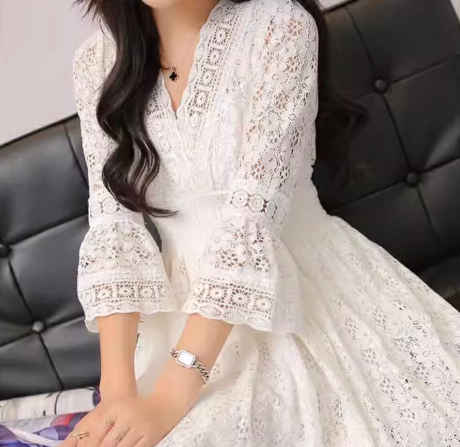 送料無料 レトロ 韓国 トレンド ワンピース レース ロングスカート フレアスカート ワンピドレス ミモレ マキシ 袖あり 7分袖 七分袖 ボリューム袖 フレアスリーブ Vネック フレア スリム タイト 細身 Aライン ウエストマーク 切り替えデザイン かわいい 大人可愛い きれいめ