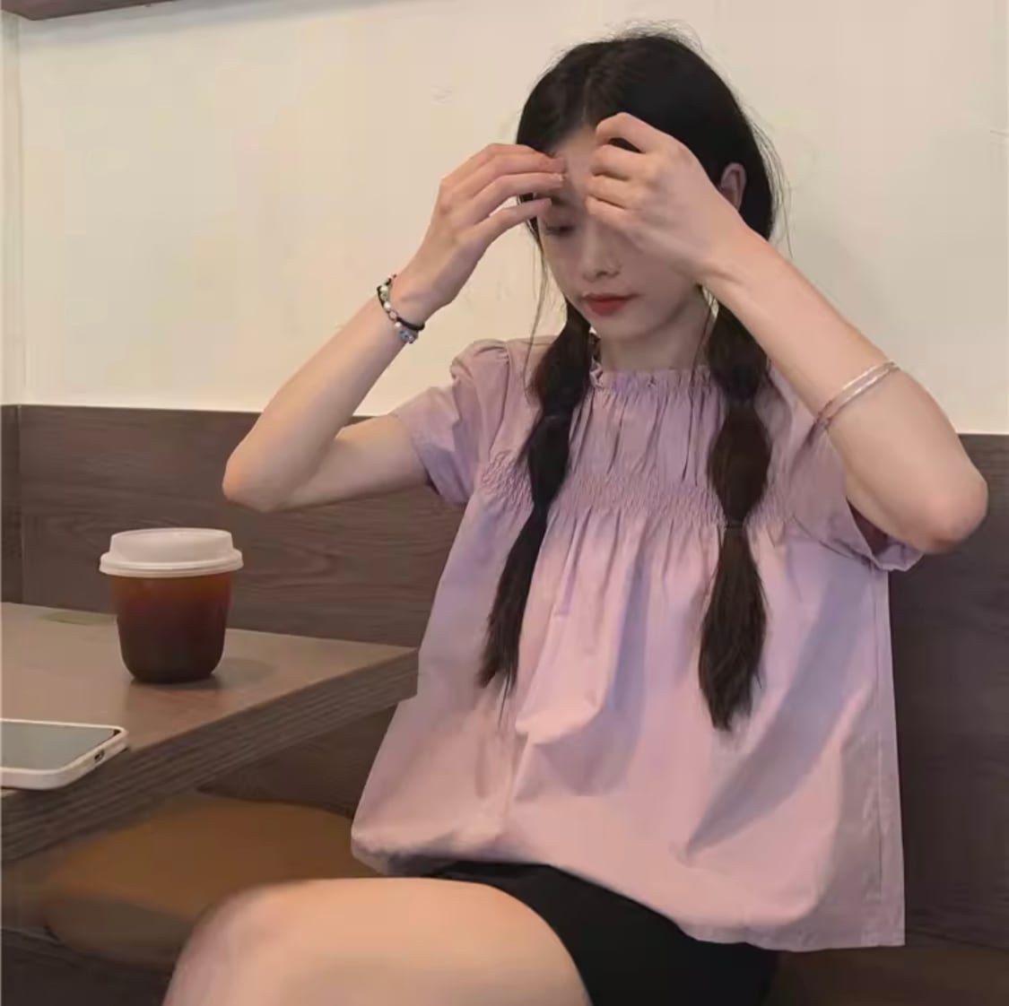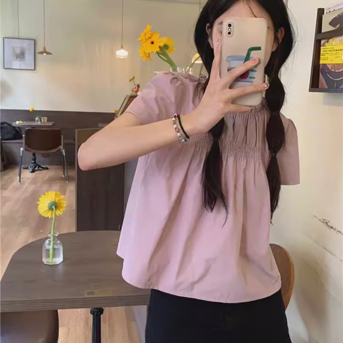 送料無料 トレンド トップス 韓国 ブラウス ミディアム丈 袖あり 半袖 Uネック ラウンドネック 襟なし フレア ストレート フリル ふわふわ 綿 コットン かわいい 大人可愛い きれいめ シンプル カジュアル 大人 上品 おしゃれ お洒落 レトロ 大人女子 こなれ感 ラフ ガーリー