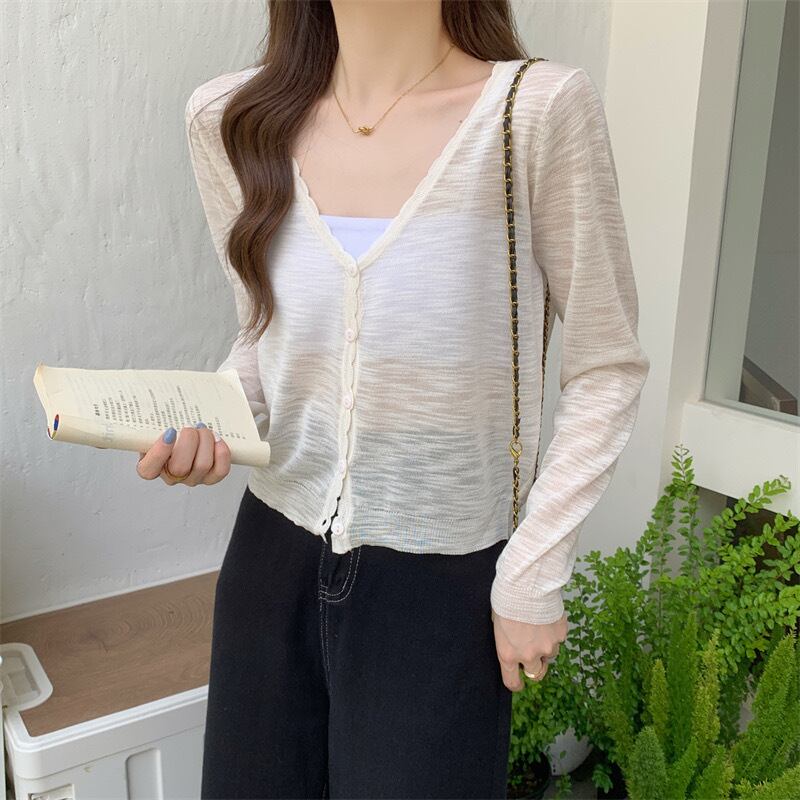 トップス カーディガン ショート丈 袖あり 長袖 Vネック 襟なし スリム 細身 ストレート 前開き 透け感 シースルー 薄手 大人可愛い きれいめ シンプル カジュアル 上品 お洒落 かっこいい レトロ 大人女子 こなれ感 エレガント 存在感 とろみ感 抜け感 無地 プリント 夏