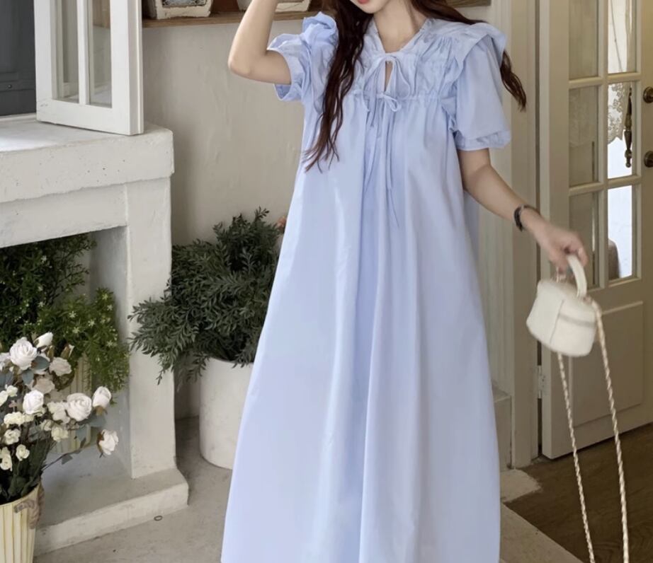 ワンピース ロング丈 袖あり 半袖 パフスリーブ 襟なし ワイド フリル リボン かわいい 大人可愛い きれいめ シンプル カジュアル 上品 おしゃれ お洒落 かっこいい 大人女子 こなれ感 ラフ ラブリー キュート ガーリー ルーズ 個性的 エレガント 主役級 存在感 無地 春