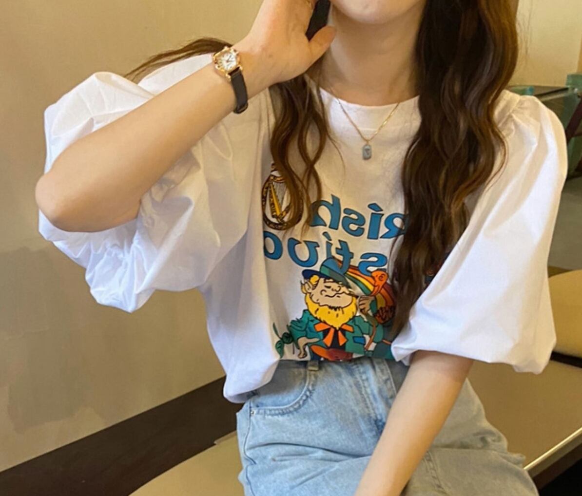 送料無料 トップス Tシャツ カットソー 袖あり 半袖 ボリューム袖 ラウンドネック かわいい 大人可愛い カジュアル ラフ キュート ガーリー 主役級 存在感 柄 プリント キャラクター 春 夏 10代 20代 30代 レディース 女性用 ママ 学生 通学 デート お出かけ 公園デビュー