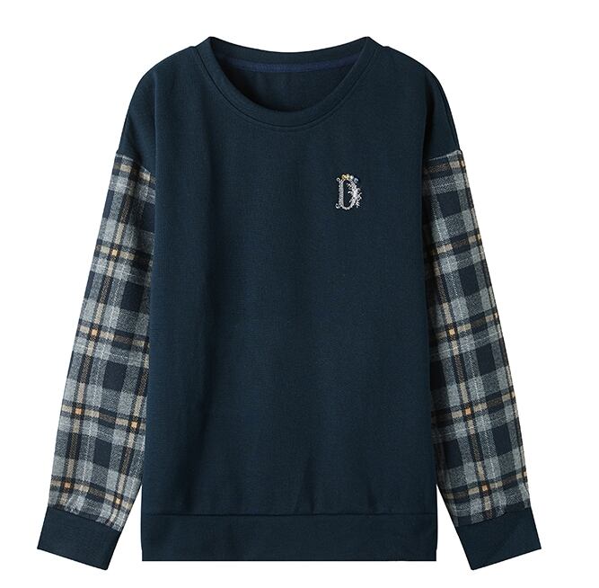 送料無料 トップス プルオーバー 袖あり 長袖 ラウンドネック 刺繍 切り替えデザイン かわいい 大人可愛い カジュアル 大人 おしゃれ お洒落 大人女子 ラフ 柄 チェック柄 秋 冬 20代 30代 40代 50代 レディース 女性用 ママ 学生 通学 デート お出かけ 公園デビュー