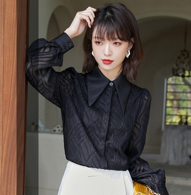 上質でエレガントなトップスが登場しました。軽やかな透け感のあるチュール素材に、刺繍やレースが施されたフェミニンでかわいらしいデザイン。落ち着いたカラーも上品な印象を与えます。袖あり長袖でカバー力も高く、上品な襟付きがより大人っぽい雰囲気を醸し出します。