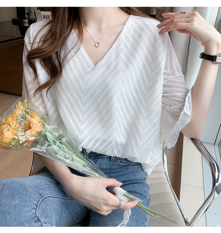 送料無料 トップス カットソー 袖あり 五分袖 フレアスリーブ Vネック 編み込み かわいい 大人可愛い きれいめ シンプル カジュアル 上品 おしゃれ お洒落 大人女子 こなれ感 とろみ感 柄 春 夏 20代 30代 40代 50代 レディース 女性用 ママ オフィス OL 通勤 学生