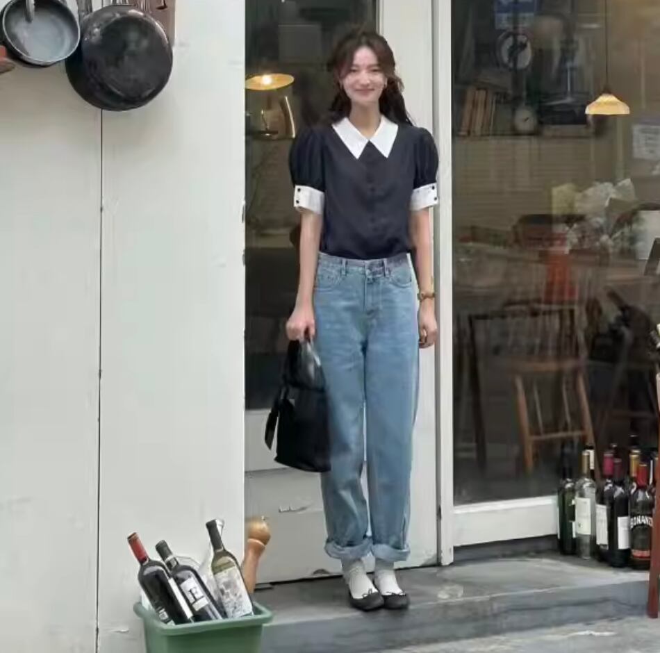 送料無料 トレンド トップス 韓国 レトロ 美シルエット ブラウス 袖あり 半袖 Vネック 襟付き スリム タイト 細身 ボタン付き かわいい 大人可愛い きれいめ シンプル 大人 上品 おしゃれ お洒落 かっこいい 大人女子 こなれ感 ガーリー クール エレガント モダン 無地 春 夏