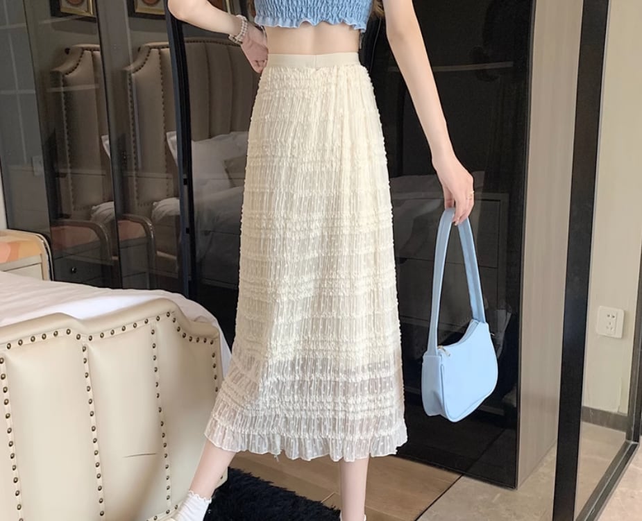 この透けるような軽やかな生地のスカートは、ロング丈で上品な印象を与えながら、Aラインのシルエットが美脚効果を発揮します。ハイウエストゴムで楽ちんな履き心地が魅力。